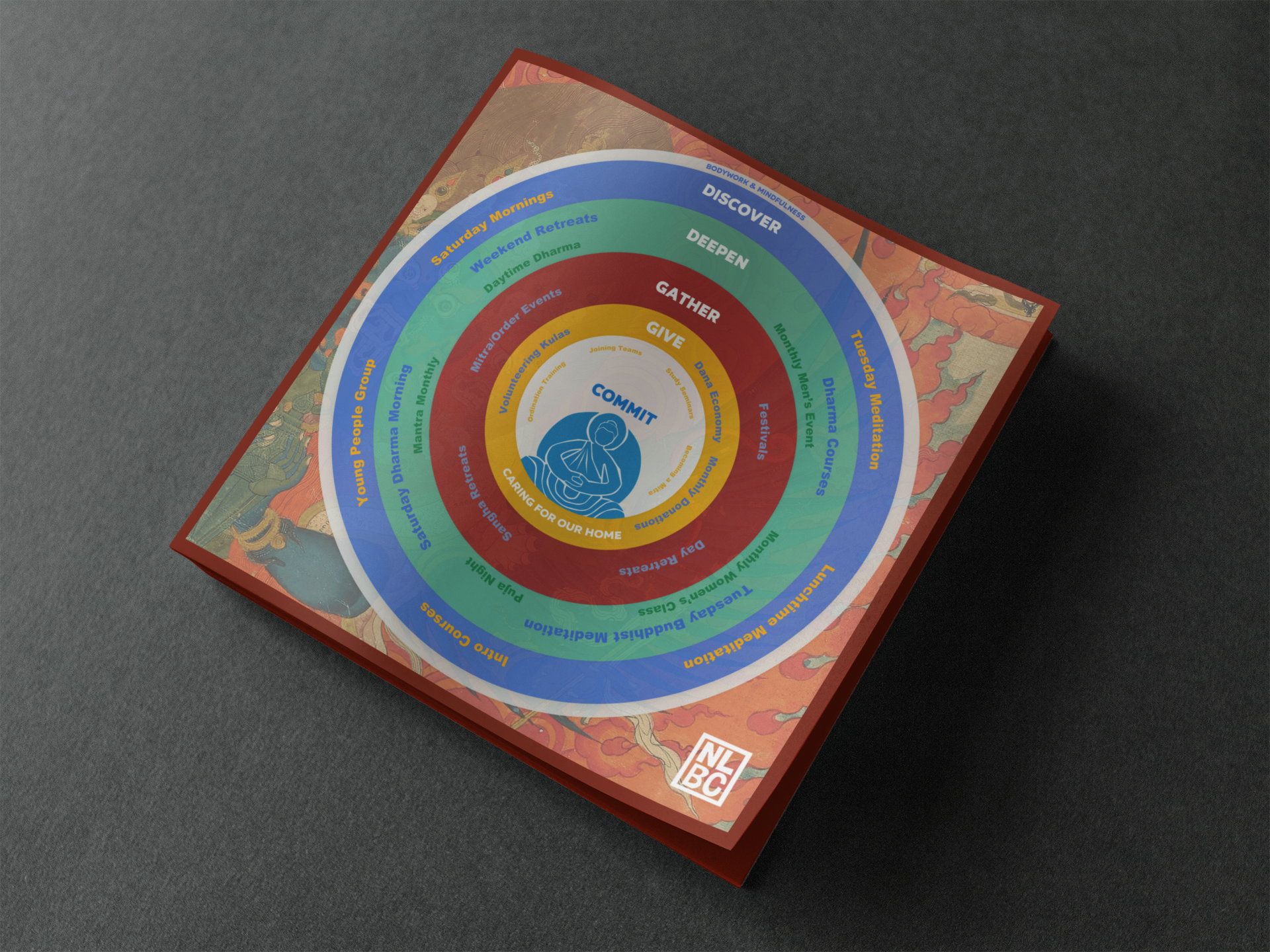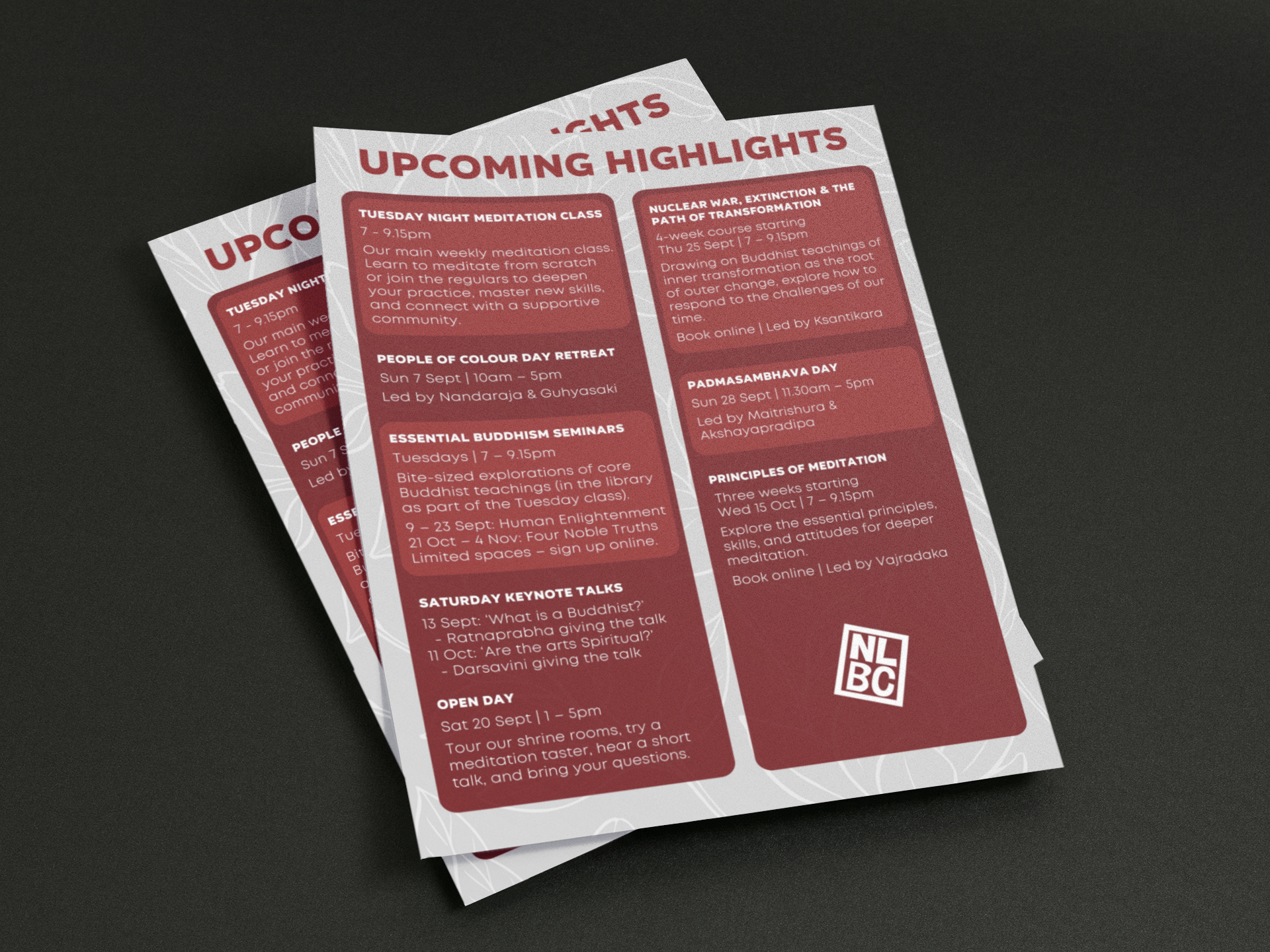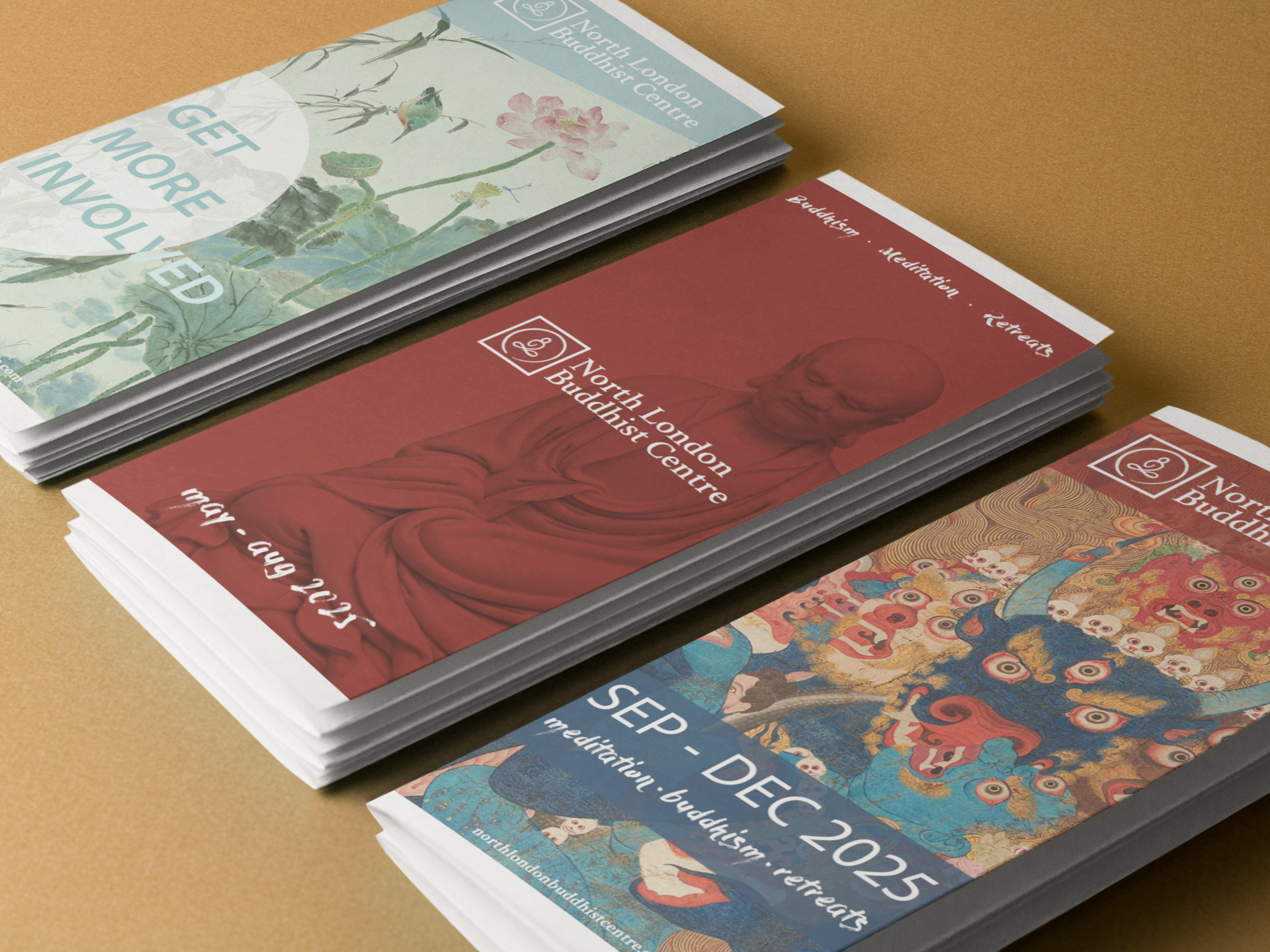 For my work with the North London Buddhist Centre, the central challenge was to preserve their established aesthetic while elevating it with more complexity, nuance, and clarity. The Centre already had a recognizable visual identity rooted in playfulness, warmth, and community friendliness, but their materials needed a refreshed energy that could engage new audiences while remaining true to their ethos. My approach was to refine and expand their design system—introducing layered compositions, dynamic color palettes, and thoughtful typography that brought greater depth without overwhelming their approachable brand presence. Below you will see a mix of older elements from their past brand identity, the current ones I have implemented, and my suggestions for future design improvements, all working together to create a more cohesive and sophisticated visual language.