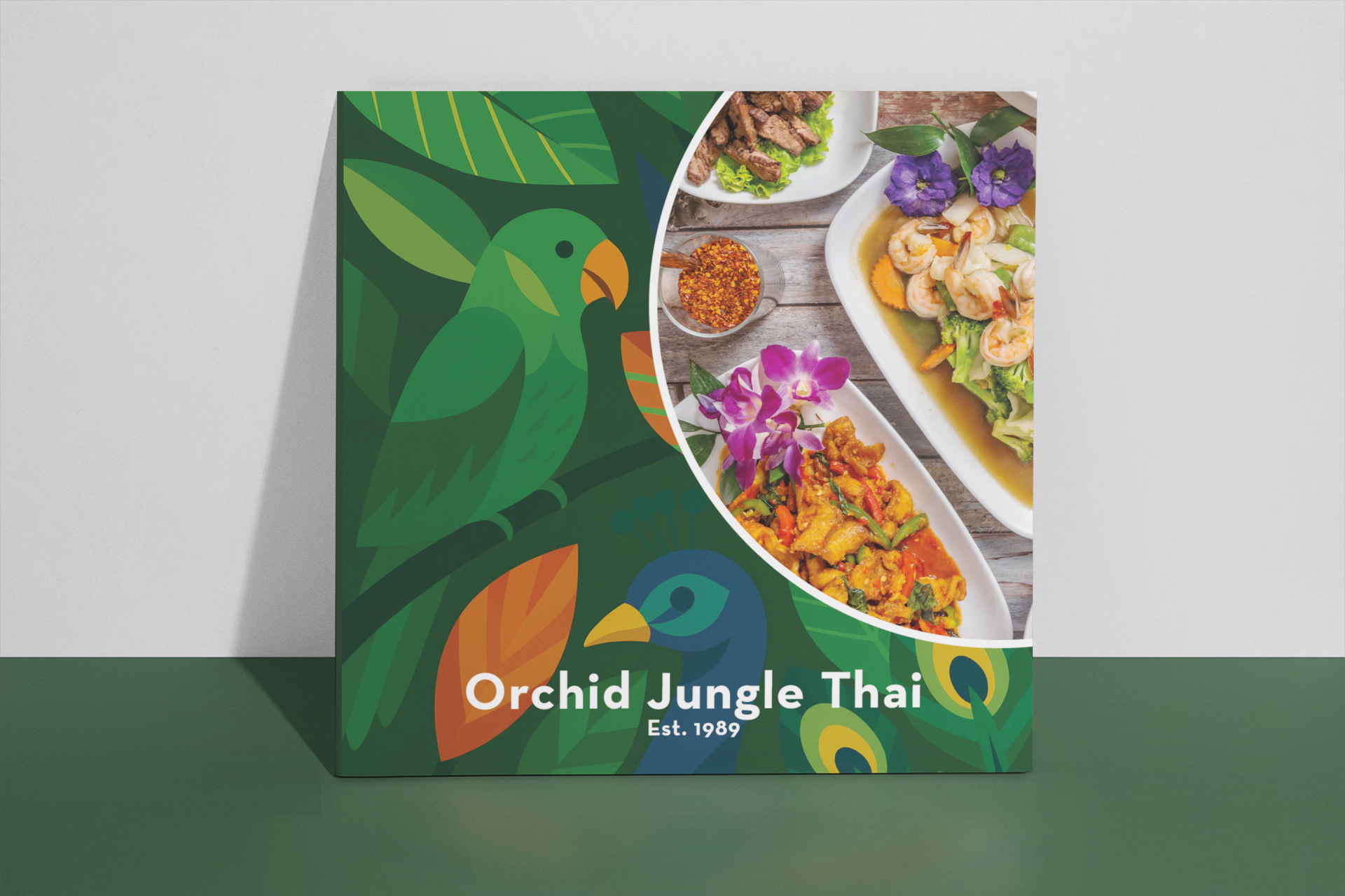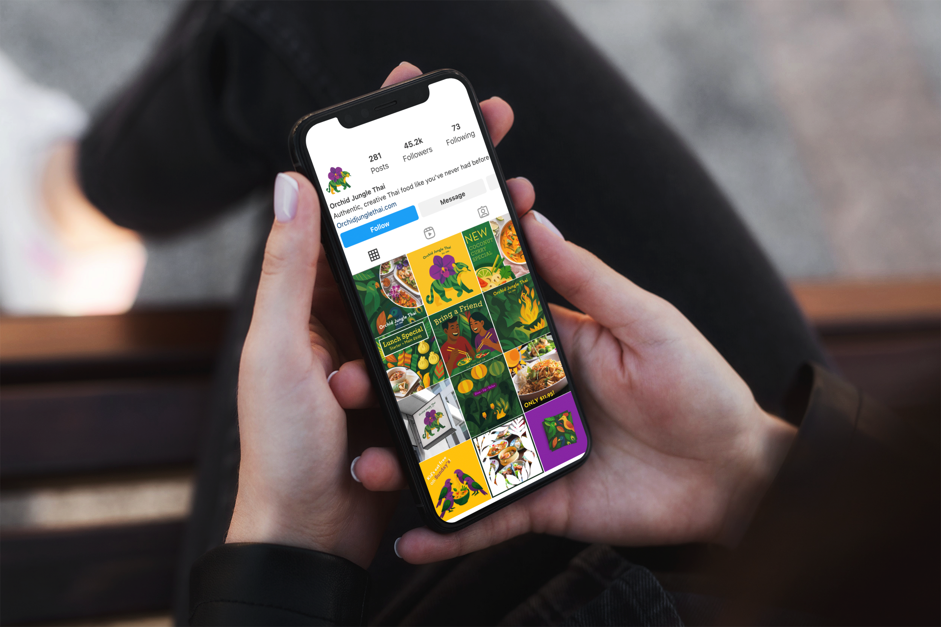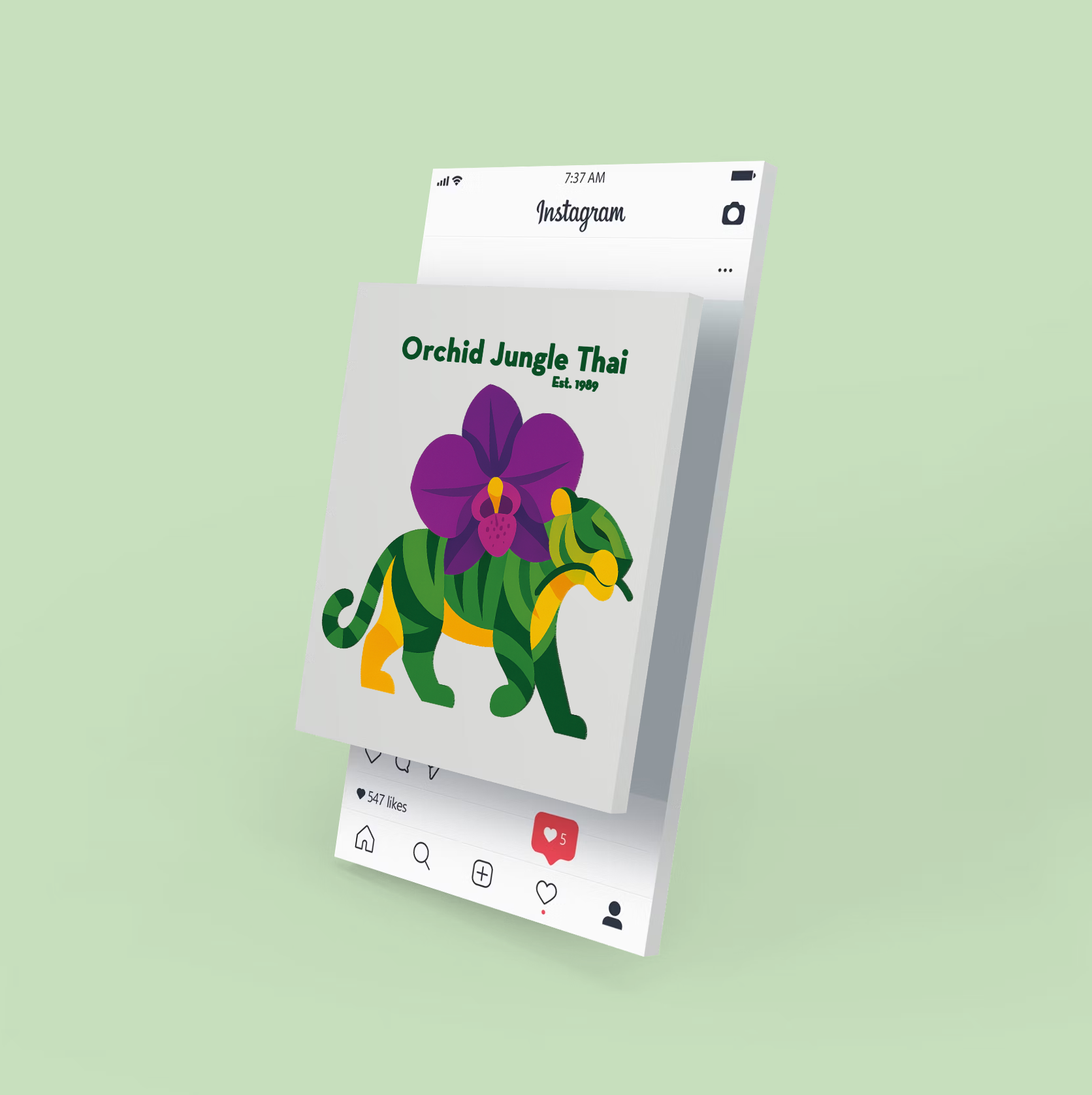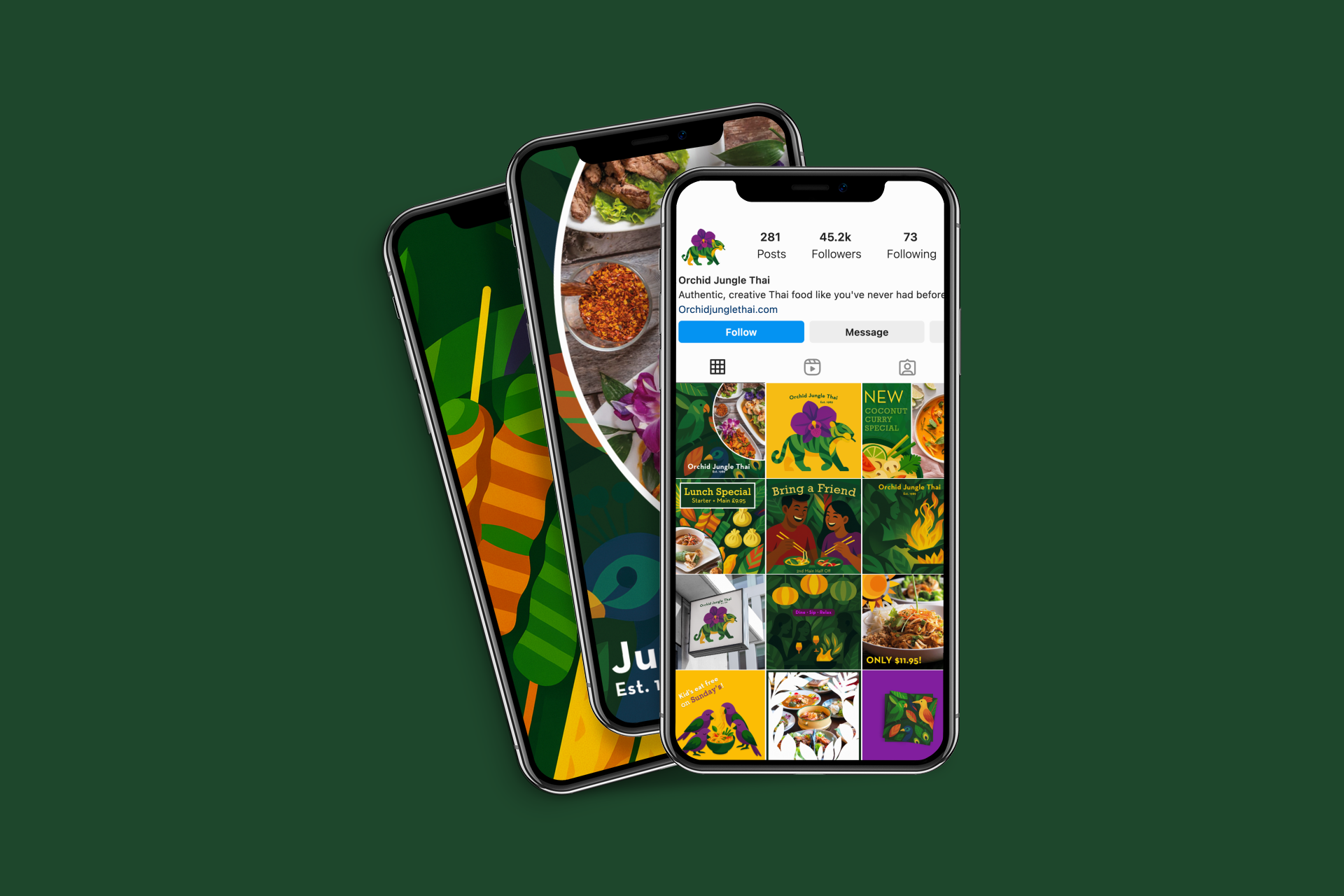 For Orchid Jungle Thai, my goal was to create a bold, engaging, and varied visual approach that would keep social media presence fresh and exciting while reinforcing brand identity. I developed a mix of illustrated elements, playful typography, and vibrant food photography to highlight both the personality of the restaurant and the richness of Thai cuisine. By combining dynamic illustrations, tropical motifs, and colorful layouts, I ensured each post stood out on its own while contributing to a consistent, memorable feed—demonstrating how design can turn simple promotions into an eye-catching and cohesive brand presence.